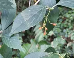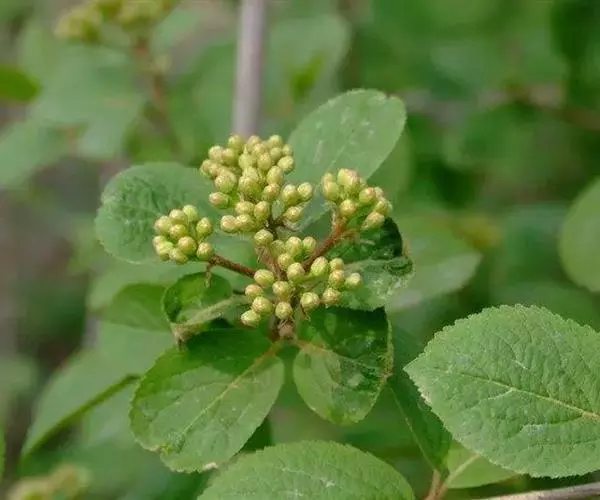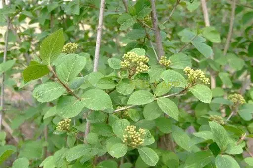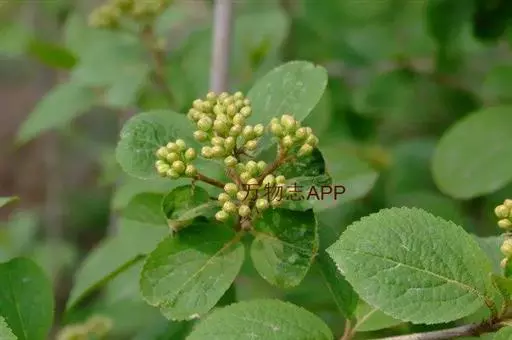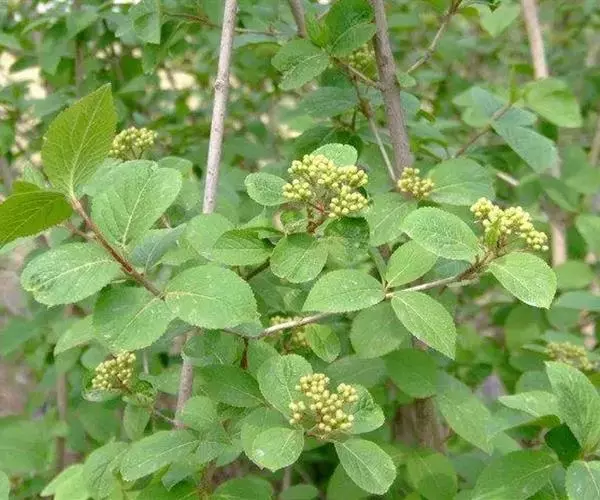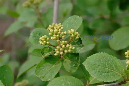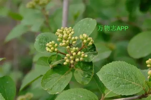 落叶灌木,高达5米,树皮暗灰色;当年小枝、冬芽、叶下面、叶柄及花序均被簇状短毛,二年生小枝黄白色,无毛。叶纸质,宽卵形至椭圆形或椭圆状倒卵形,长(3-)4-6(-10)厘米,顶端尖,稀稍钝,基部钝或圆形,两侧常不等,边缘有牙齿状小锯齿,初时上面疏被簇状毛或无毛,成长后下面常仅主脉及侧脉上有毛,侧脉5-6对,近缘前互相网结,连同中脉上面略凹陷,下面凸起;叶柄长5-12毫米。
