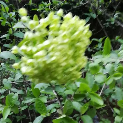 聚伞花序直径4-5厘米,总花梗长达2厘米或几无,第一级辐射枝5条,花大部生于第二级辐射枝上,萼筒矩圆筒形,长约4毫米,无毛,萼齿三角形;花冠白色,辐状,直径约7毫米,无毛,裂片宽卵形,长2.5-3毫米,比筒部长近2倍;花药宽椭圆形,长约1毫米。果实红色,后变黑色,椭圆形至矩圆形,长约1厘米;核扁,矩圆形,长9-10毫米,直径4-5毫米,有2条背沟和3条腹沟。花期5-6月,果熟期8-9月。