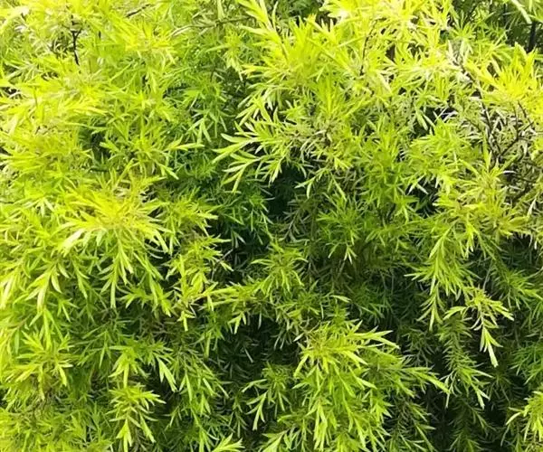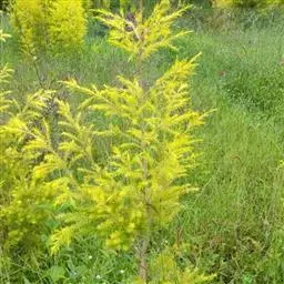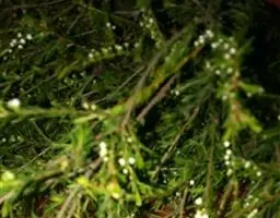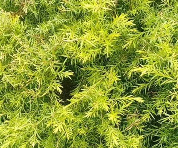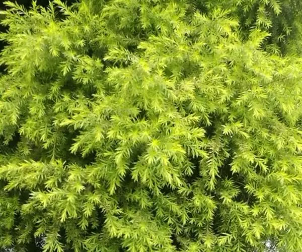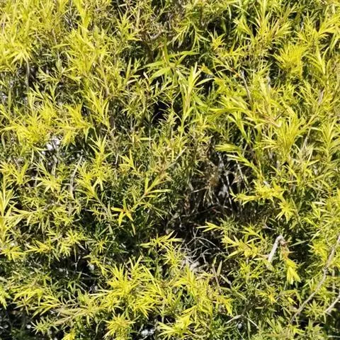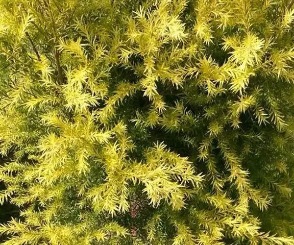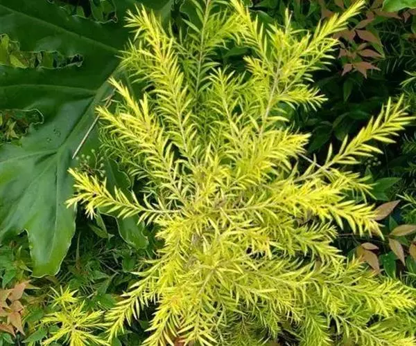 常绿乔木,树高可达6-8米,冠幅锥形。主干直立,枝条密集、细长、柔软,嫩枝红色。树皮纵裂,枝条柔软密集。叶互生,金黄色,窄卵形至卵形,长10-28毫米,宽1.5-3毫米,叶脉5-11,叶尖锐尖到尖,叶无毛或偶有软毛,无叶柄,具芳香味。穗状花序,花序有少到多个尖状花组成,长1.5-3.5厘米,花轴被软毛,同一苞片内有1到3个白色花,花瓣近圆柱形,长1.5-2毫米;每束雄蕊16-25个;花瓣绿白色。果实为蒴果。果近球形,果径2-3毫米,具有一个2毫米直径的孔,萼片宿存。 [1-2]
