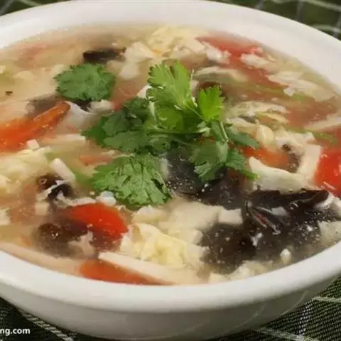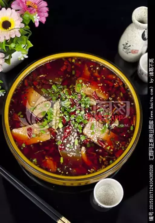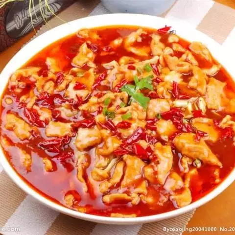 将辣椒、花椒、豆瓣酱、姜、蒜、色拉油放入锅中,用小火煸炒香,加汤熬制后,捞出渣,然后放入味精、白糖、醋等调料。 将主辅料切片、改刀、飞水,加入熬好的红汤汁内,烧开后装入盛器,撒入葱花。 将色拉油烧热,放入花椒、辣椒,炝出香味,迅速浇在上面即成。