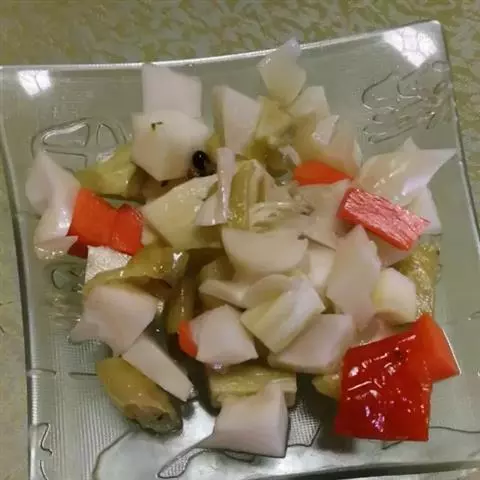 2、炒锅放置旺火上,加入少许油将海白菜,芹菜,大葱节,黄豆芽炒熟,放入味精,加少许香油,起锅装碗内做碗内做底用。