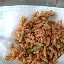 8、 炒锅置旺火上,倒油烧至六成热,放入辣椒节炸呈棕红色,下花椒炸香,淋在盆内上桌。