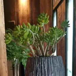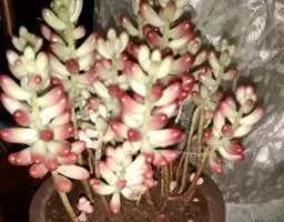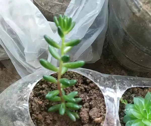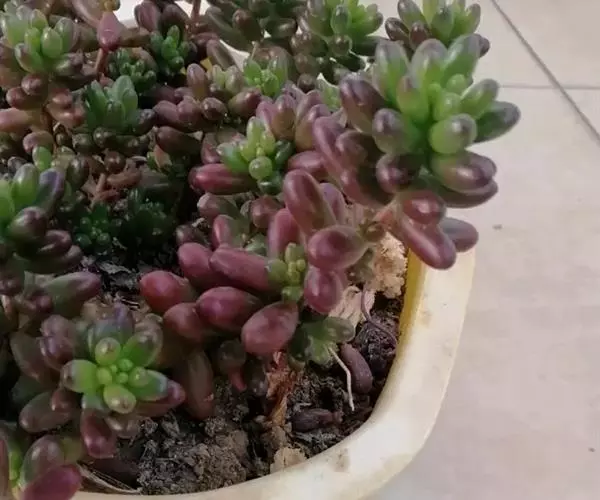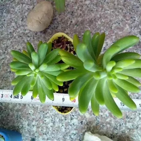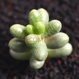 多年生肉质草本植物。株高10-20厘米,多分枝。肉质叶膨大互生,圆筒形至卵形,长2厘米,绿色,表皮光亮、无白粉,在阳光充足的条件下转为红褐色,小花淡黄红色。