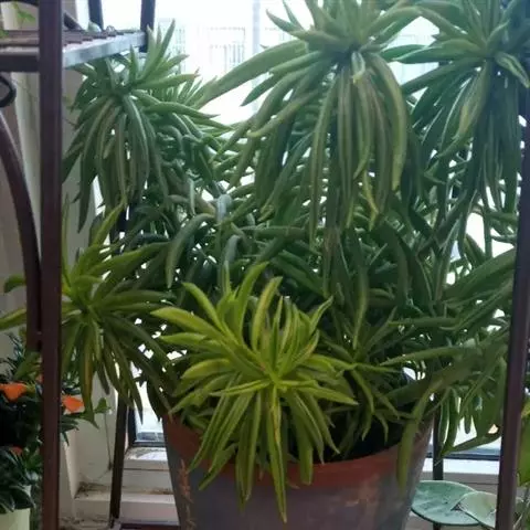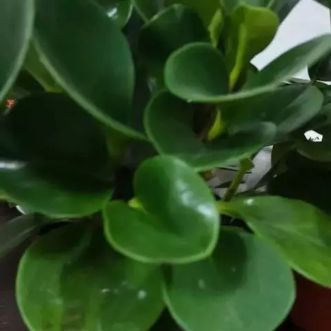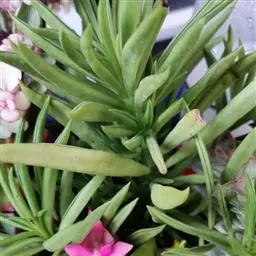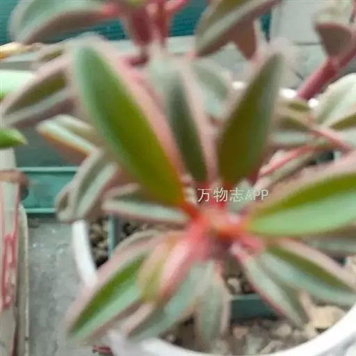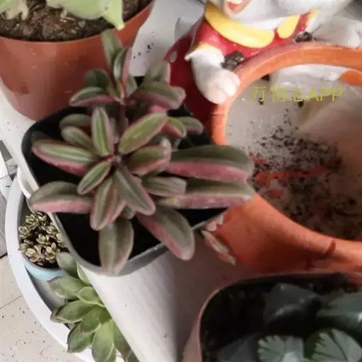 肥厚多肉的叶片椭圆形,对生或轮生,具短柄,叶片两边向上翻,使叶面中间形成一浅沟,背面呈龙骨状突起。叶面光亮,稍呈透明状。花序棒状,绿色,春夏季节开放。