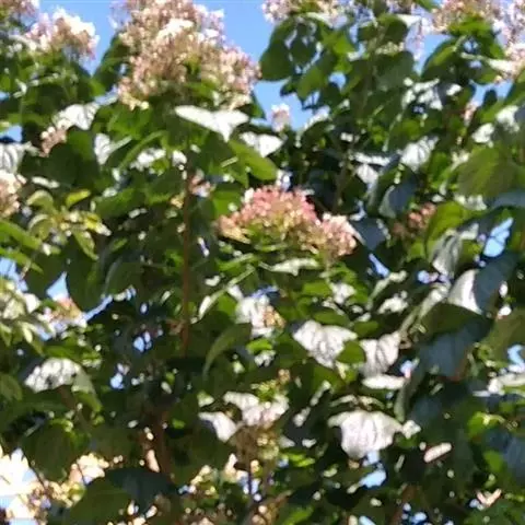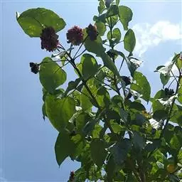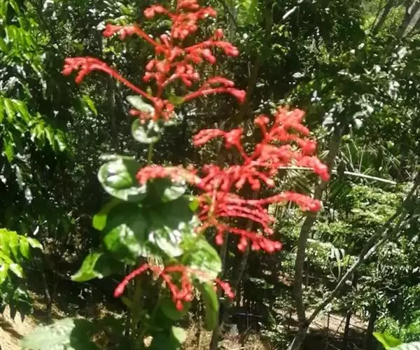 二歧聚伞花序组成顶生,大而开展的圆锥花序,长15-34厘米,宽13-35厘米,花序的最后侧枝呈总状花序,长可达16厘米,苞片宽卵形、卵状披针形、倒卵状披针形、线状披针形,有柄或无柄,小苞片线形;花萼红色,外面疏被短柔毛,散生盾形腺体,长1-1.5厘米,深5裂,裂片卵形或卵状披针形,渐尖,长0.7-1.3厘米,开展,外面有1-3条细脉,脉上具短柔毛,内面无毛,有疏珠状腺点;花冠红色,稀白色,花冠管长1.7-2.2厘米,外面具微毛,里面无毛,顶端5裂,裂片长圆形,开展,长1-1.5厘米;雄蕊长约达花冠管的3倍;子房无毛,4室,柱头2浅裂,与雄蕊均长突出于花冠外。果实椭圆状球形,绿色或蓝黑色,径7-10毫米,常分裂成2-4个分核,宿萼增大,初包被果实,后向外反折呈星状。花果期5-11月。
