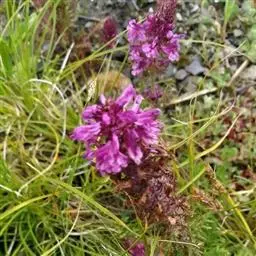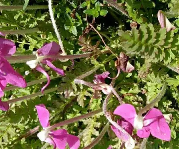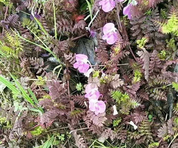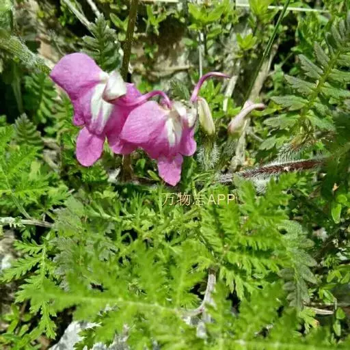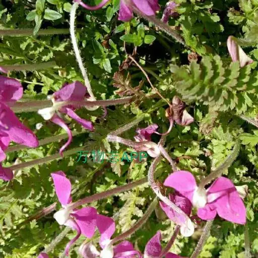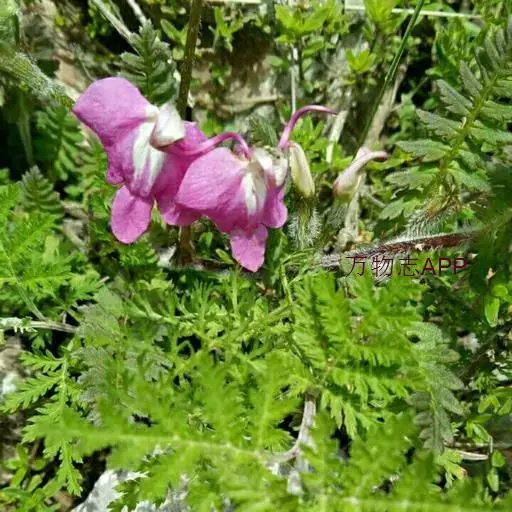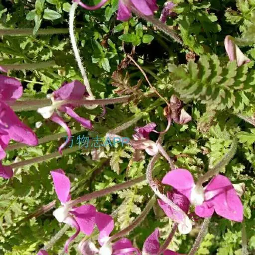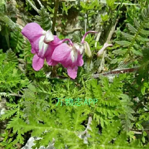 藓生马先蒿又名:藓状马先蒿。多年生草本,干时多少变黑,多毛。根茎粗,有分枝,端有宿存鳞片。茎丛生,在中间者直立,在外围者多弯曲上升或倾卧,长达25厘米,常成密丛。叶有柄,柄长达1.5厘米,有疏长毛;叶片椭圆形至披针形,长达5厘米,羽状全裂,裂片常互生,每边4-9枚,有小柄,卵形至披针形,有锐重锯齿,齿有凸尖,面有疏短毛,沿中肋有密细毛,背面几光滑。花皆腋生,自基部即开始着生,梗长达15毫米,一般较短,密被白长毛至几乎光滑;萼圆筒形,长达11毫米,前方不裂,主脉5条,上有长毛,齿5枚,略相等,基部三角形而连于萼管,向上渐细,均全缘,至近端处膨大卵形,具有少数锯齿;花冠玫瑰色,管长4-7.5厘米,外面有毛,盔直立部分很短,几在基部即向左方扭折使其顶部向下,前方渐细为卷曲或S形的长喙,喙因盔扭折之故而反向上方卷曲,长达10毫米或更多,下唇极大,宽达2厘米,长亦如之,侧裂极大,宽达1厘米,稍指向外方,中裂较狭,为长圆形,长约8毫米,宽6.5毫米,钝头;花丝两对均无毛,花柱稍稍伸出于喙端。蒴果稍扁平,偏卵形,长1厘米,宽7毫米,为宿萼所包。花期5-7月;果期8月。