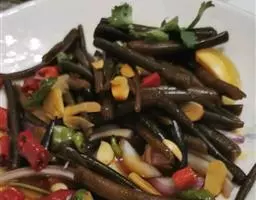 黑木耳和猪肉(切下来的瘦肉)一起放锅里炒熟并加少许盐。