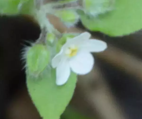花序短,长1~1.5cm,含少数花,密生短伏毛;花萼5裂至基部,长2.5~3mm,裂片披针形,背面有密短伏毛,腹面稍有毛;花冠白色或带紫色,筒部比萼短(长约1.6mm),檐部比筒部长一倍,裂片倒卵形;雄蕊5,着生于花冠筒中部稍上,内藏,花丝很短,花药长圆形,长约0.6mm,喉部附属物半圆形,有乳头。子房4裂,花柱长约1.5mm,柱头微小,头状。