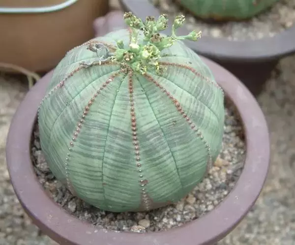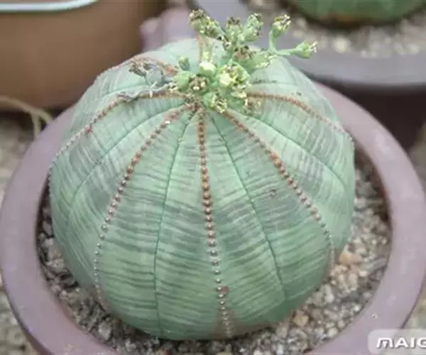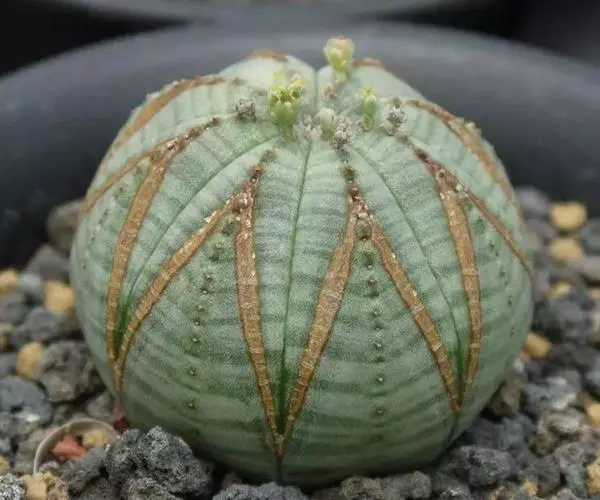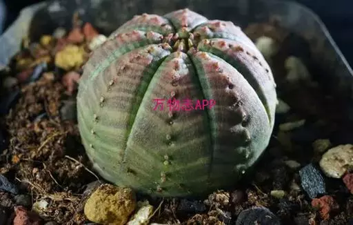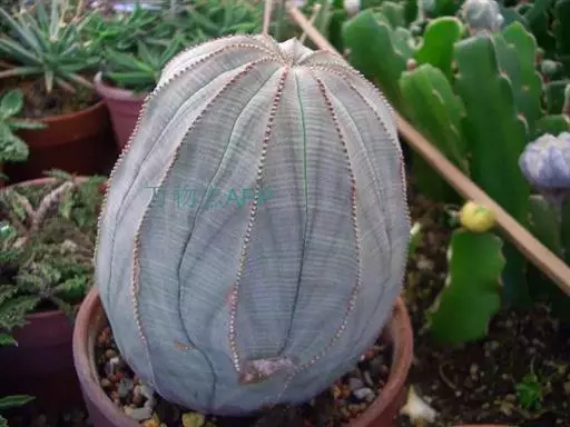 布纹球 ,又名晃玉、奥贝莎,属于大戟科大戟属植物。原产南非开普省。植株小球形,直径8—12厘米。具棱8,整齐。表皮灰绿色中有红褐色纵横交错的条纹,顶部条纹较密。棱缘上有褐色小钝齿。