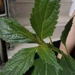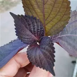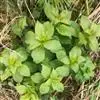 叶具柄,柄长2-7毫米,腹面具槽,背面近圆形,被柔毛,叶片卵圆形或长圆状卵圆形,长1-4厘米,宽0.4-1.5厘米,先端钝或稍钝,基部宽楔形至近圆形或微心形,全缘或有远离的小锯齿,上面亮绿色,常带紫晕,具不明显的柔毛及凹陷的腺点,下面淡绿色,明显被柔毛及凹陷的腺点,侧脉3-5对,与中脉在上面不显著,下面多少突出;苞叶大多无柄,常带紫色。