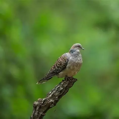 山斑鸠,是鸽形目鸽鸠科斑鸠属鸟类,又名金背斑鸠、棕背斑鸠、山鸠、金背鸠、麒麟斑、麒麟鸠、东方斑鸠、绿斑鸠、山鸽子。山斑鸠颈侧具明显黑白色条纹的块状斑,上体深褐色、具扇贝状斑纹,羽缘棕色,尾羽近黑色,下体多偏粉色。虹膜黄色,喙灰色,脚粉色。山斑鸠是留鸟,在中国常见且分布广泛。此外,还分布于不丹、尼泊尔、巴基斯坦、印度、日本等国。栖息于针阔混交林、季风常绿阔叶林、果园及农耕区,多成对活动于开阔农耕区、村舍、寺院周围及防火林带。取食于地面,主要觅食植物种子、果实、嫩芽等,也吃昆虫。山斑鸠飞翔时鼓翼快速,叫声为反复而低沉的“咕咕咕”声。繁殖期在4-7月,营巢于林中树上,通常一年繁殖2窝,窝卵数2枚,由雌雄亲鸟轮流孵卵,孵化期18~19天。山斑鸠的肉、卵可食,肉入药可益气明目、强筋壮骨,治久病气虚、衰弱无力、两目昏暗等病症。山斑鸠啄食杂草种子,对农田清除杂草有益;但有时也刨食农作物及树的种子。山斑鸠