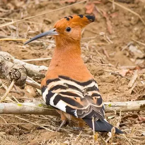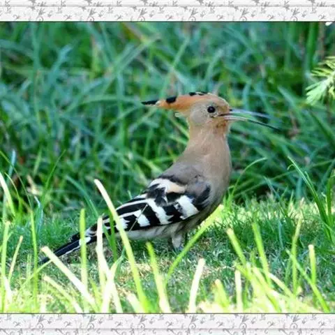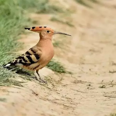 戴胜(学名:Upupa epops):共有8个亚种。依不同亚种体长26-28厘米,翼展42-46厘米,体重55-80克。头顶羽冠长而阔,呈扇形。颜包为棕红色或沙粉红色,具黑色端斑和白色次端斑。头侧和后颈淡棕色,上背和肩灰棕色。下背黑色而杂有淡棕白色宽阔横斑。初级飞羽黑色,飞羽中部具一道宽阔的白色横斑,其余飞羽具多道白色横斑。翅上覆羽黑色,也具较宽的白色或棕白色横斑。腰白色,尾羽黑色而中部具一白色横斑。颏、喉和上胸葡萄棕色。腹白色而杂有褐色纵纹。虹膜暗褐色。嘴细长而向下弯曲,黑色,基部淡肉色,脚和趾铅色或褐色。