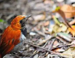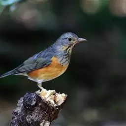 栗腹歌鸲(图2) 雄鸟:体小的深色歌鸲(15厘米),上体青石蓝色;眉纹白,喉、胸及两胁栗色;眼先及脸颊黑;腹中心及尾下覆羽白色。雌鸟:上体橄榄褐色,下体偏白,胸及两胁沾赭黄。幼鸟深褐色而具皮黄色点斑。虹膜-褐色;嘴-夏季黑色,冬季上嘴褐色,下嘴近粉;脚-粉褐。
