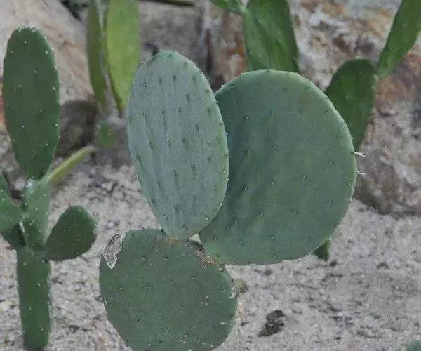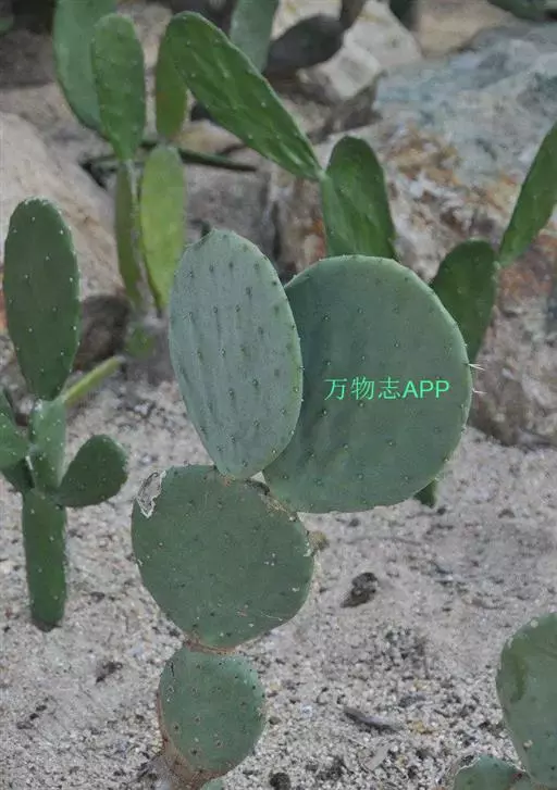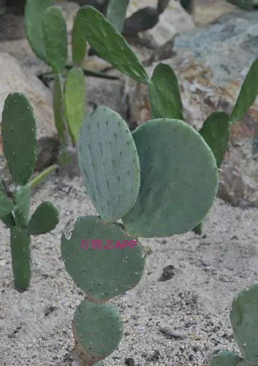 多年生草本多浆植物。植株直立,高4-5米,或多或少有不同的树干。分支的节段,通常被认为是叶子,但实际上是扁平的茎,并且由簇生,簇生有许多倒刺的刚毛(球状),通常无脊椎,具1到5个尖刺,每个小孔长4厘米。茎节圆形或近圆形,茎节长15-40厘米,宽10-28厘米,非常厚,最大2.5厘米,每重达2千克;蓝绿色,常被白粉;无毛乳晕下有红色的紫色斑点。刺座较稀,间隔4-5.5厘米,边缘有黑色的短毛毡,中间有淡黄色的白色或棕色毛毡,针形针无数,淡黄色至棕色,丝质,稀薄,在垫的边缘小孔中的针形针更长。每刺座有刺8-12根,长5厘米,白色,基部黄褐色。在栽培中一般刺少且短。叶片长4毫米,带红色,鳞片状,圆锥形,尖锐,仅在年轻的部分上在小孔下产生,随着部分的成熟很快脱落。