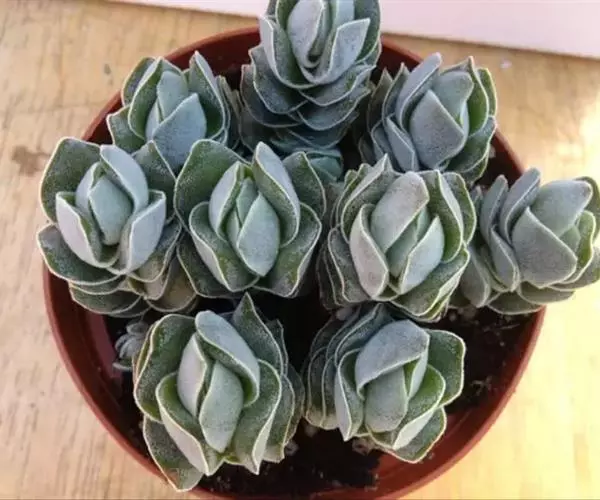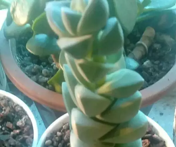 叶常年灰绿色,层层紧密排列,交互对生。正面扁平,背面棱凸。叶片微绒毛感,叶面有小绿暗点,俯视植株叶片组成近似正方形,侧看就象一座塔;弱光状态则叶片拉长,排列出现间距。花乳白色,花五瓣,簇生,伞形花序。