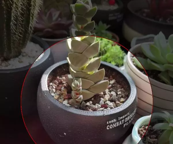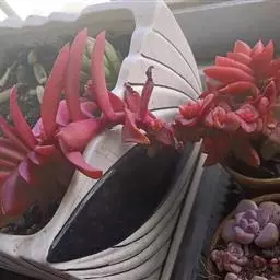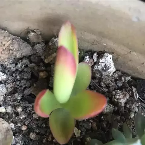叶子表面宽厚,富肉质感且带有磨纱质感,看像石头质地;开红色小花,生于植株顶部,倒伞形密生,形状像花…