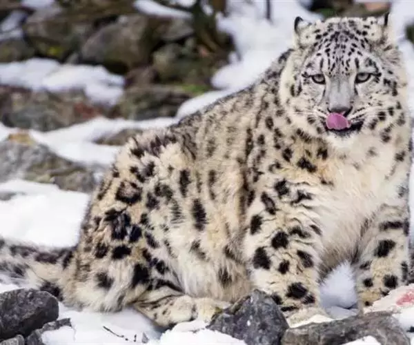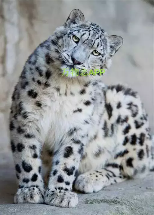 雪豹,体长110~130厘米;尾长90~100厘米,体重一般50~80公斤之间。全身灰白色,布满黑斑。头部黑斑小而密,背部、体侧及四肢外缘形成不规则的黑环,越往体后黑环越大,背部及体侧黑环中有几个小黑点,四肢外缘黑环内灰白色,无黑点,在背部由肩部开始,黑斑形成三条线直至尾根,后部的黑环边宽而大,至尾端最为明显,尾尖黑色。