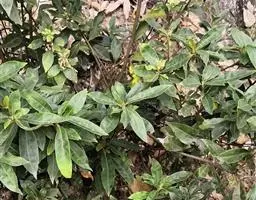 常绿灌木,高2-3米;小枝对生。叶革质,卵状椭圆形或长圆状椭圆形,长7-18厘米,宽4-10厘米,干时变棕黑色,叶面光亮,具黄色斑纹,侧脉扁平或微凹,背面光滑无毛,边缘在中部以上具5-7对牙齿;叶柄长2-4厘米,腹部具沟,无毛。圆锥花序顶生;雄花序长10-14厘米;雌花序为短圆锥花序;花瓣紫红色或暗紫色,近于卵形或椭圆状披针形,背部无毛,顶端尖尾状;雄花花萼杯状,顶端全缘;雄蕊短,长仅1毫米;花下面具1枚小苞片;雌花子房疏被柔毛,柱头偏斜;花下具2枚小苞片。浆果长卵圆形,成熟时暗紫色或黑色,长1.5-2厘米,直径8-10毫米;果柄长3-4毫米。