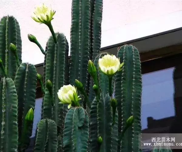 多分枝,蓝绿色,高4米至5米,棱边有小刺,极短。龙骨柱夏季开白花,4朵至9朵,丛生于上部的刺座上,昼开夜闭(盆栽一般不易开花),浆果小圆形,蓝紫色,可食。