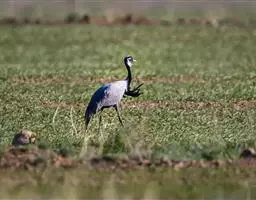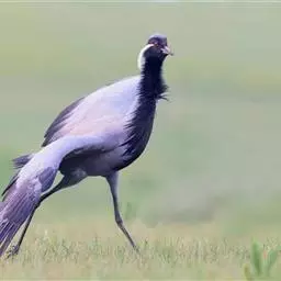 蓑羽鹤大型涉禽,体长68~92厘米,是鹤类中个体最小者。通体蓝灰色,眼先、头侧、喉和前颈黑色,…