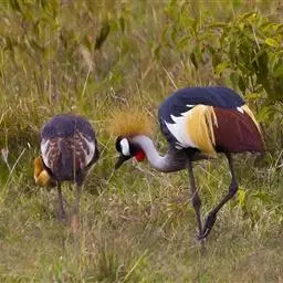 东非冕鹤(学名:Balearica regulorum)是大型涉禽。体长127厘米。额部向外凸出,有乌黑色绒羽,枕部有由无数条土黄色绒丝向四周放射所形成的绒球状冠羽。眼睛后方的面颊有上红下白的斑块。颈长。喉部有红色肉垂。体羽主要为浅蓝灰色,翅膀上的覆羽为白色,飞羽栗色。嘴、跗跖、趾均为黑色。栖息于湿地环境及人类居住区内的半天然栖息地。白天活动,喜欢在沼泽边缘,善于在田埂上、水田里、水沟边、草地上等处行走,还常常飞到附近居民的院子里觅食、戏耍。为杂食性动物。每年5-7月在沼泽地带繁殖。主要分布在非洲东部的乌干达、乍得、塞内加尔、肯尼亚、南苏丹、扎伊尔东部、坦桑尼亚北部和埃塞俄比亚西部等地区。是乌干达的国鸟。