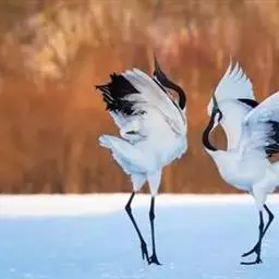 到了繁殖的季节,天性“喜歌善舞”的东非冕鹤经常成双结对地跳起优美的舞蹈。它们先是相互躬身颌首,以表相邀之意,然后双翅微展,企足延颈,跳将起来。舞步起始轻盈,渐趋急骤,最后竟如醉似痴。东非冕鹤喜欢鸣叫,“哦啊!哦啊!”的声音轻柔舒缓,清脆动人,或抒发自己的欢愉,或表达相互的情爱,特别是在子夜和黎明时分,声闻遐迩。所以,当地的农家、牧民都把它们同司晨的公鸡一样对待,当作一种时感很强的生物钟。