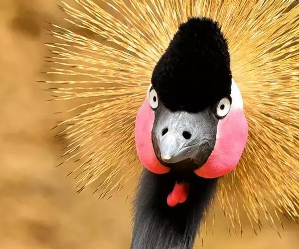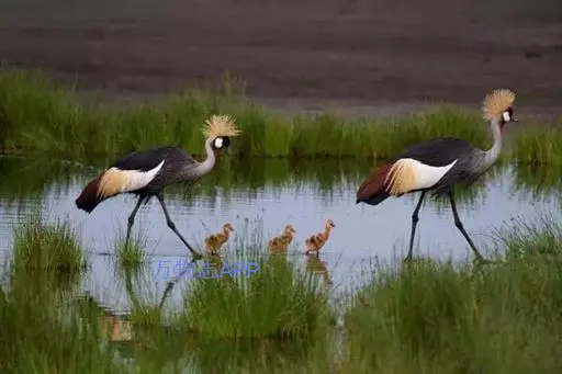 东非冕鹤也叫灰冠鹤,体长110厘米,翼展180-200厘米,体重3000-4000克。 具有瘦长挺立的双腿,伸展自如的长颈,优美动人的体态,大有超凡脱俗之气概。它的雄鸟与雌鸟的羽色非常相似,全身的羽毛都呈深浅不同的灰色,飞羽为白色,翼尖和尾羽为棕褐色,光华熠熠。但最为楚楚动人之处,还是它的头部,清癯的双颊上嵌着上面是小块红色,下面为大块白色的斑块,以及一对炯炯有神的小圆眼睛,喉下悬垂着两个红色的大肉垂。头顶前部的羽毛象覆盖着一块乌黑的绒缎,柔软光洁,后部则佩戴着一顶挺硬的丝毛织成的锦冠,金光闪耀,就象皇冠一样美丽。