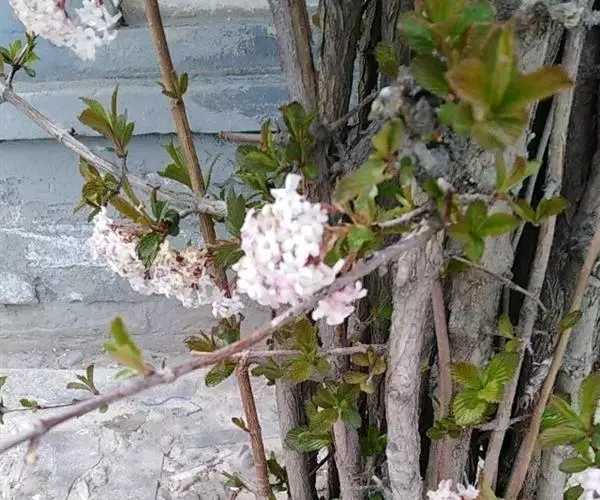 落叶灌木, 香荚蒾 高达5米;当年小枝绿色,近无毛,二年生小枝红褐色,后变灰褐色或灰白色。冬芽椭圆形,顶尖,有2-3对鳞片。