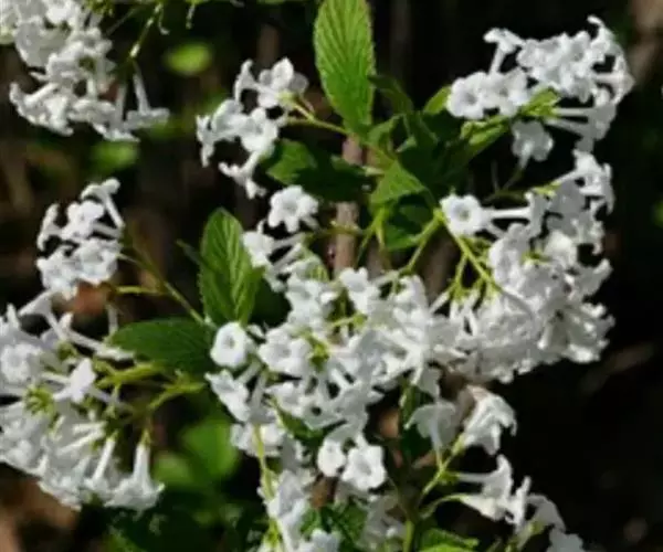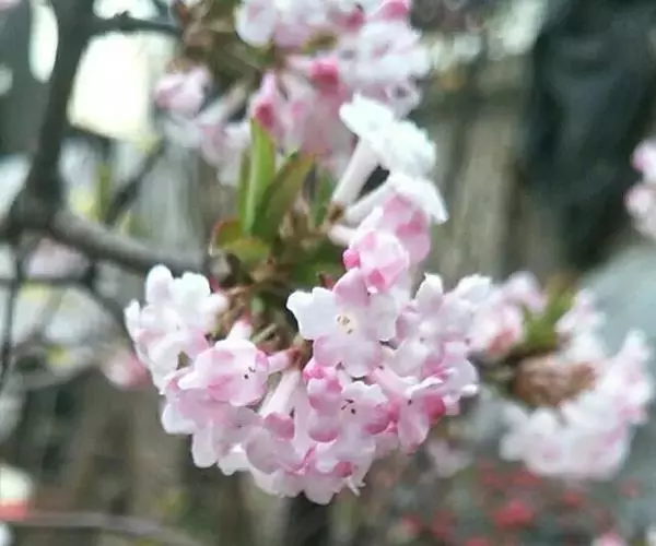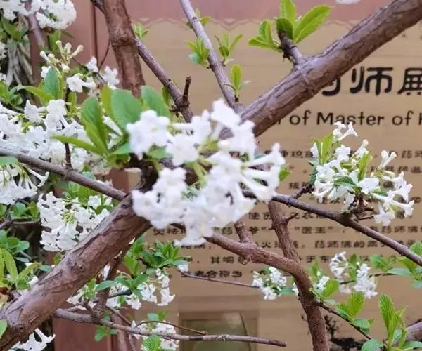 圆锥花序生于能生幼叶的短枝之顶,长3-5厘米,有多数花,幼时略被细短毛,后变无毛,花先叶开放,芳香;苞片条状披针形,具缘毛;萼筒筒状倒圆锥形,长约2毫米,萼齿卵形,长约0.5毫米,顶钝;花冠蕾时粉红色,开后变白色,高脚碟状,直径约1厘米,筒长7-10毫米,上部略扩张,裂片5(-4)枚,长约4毫米,宽约3毫米,开展;雄蕊生于花冠筒内中部以上,着生点不等高,花丝极短或不存在,花药黄白色,近圆形;柱头3裂,不高出萼齿。