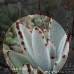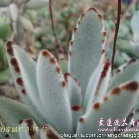 褐斑伽蓝是景天科、伽蓝菜属多年生肉质草本植物或小灌木。全株灰白色,密布白色茸毛。叶片长卵形,…