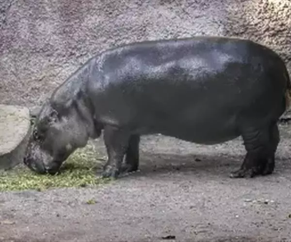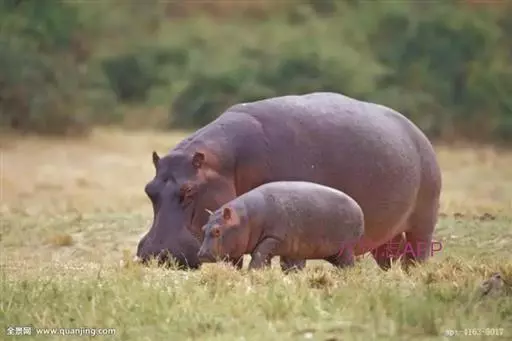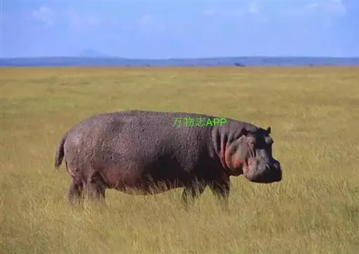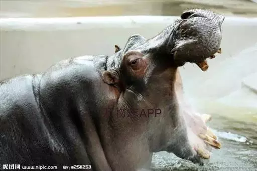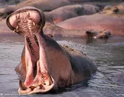 河马是陆地上仅次于象的第二大哺乳动物,体躯庞大而拙笨,体长为350-450厘米,尾长约56厘米,体重3000-3500千克,但比较矮,四肢特别短,肩高只有140-165厘米,还不及象的一半高。有一个粗硕的头和一张特别大的嘴,比陆地上任何一种动物的嘴都大,并且足可以张开呈90度角。嘴里的牙也很大,门齿和犬齿均呈獠牙状,是进攻的主要武器,下门齿不是向上生长,而是像铲子一样向前面平行伸出,长度可达60-70厘米,重量为2-3千克,犬齿的长度也达75厘米左右。眼睛、鼻孔、耳壳等都生在面部的上端,几乎在同一个平面上。皮肤很厚,背部和两侧的厚度可达4-5厘米,呈黑褐色兼赤紫色,光滑无毛,仅在嘴端、耳内侧和尾巴上有一些毛。前后肢上各有大小几乎相等的4趾,趾尖有蹄,其形状如同扁爪,趾间略微有蹼。