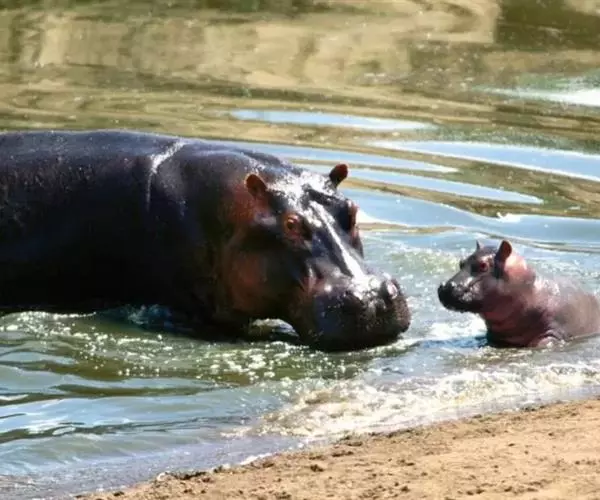 雌河马一般会单独带着小河马生活两个月,安静地享受着天伦之乐。母子俩常常静静地躺着休息,小河马紧紧地依偎在母亲的嘴边。有时,母亲又想带它下水去,因为河马总是摆脱不了如何稳定体温的问题,岸上呆久了,就要下水去降降温,这时小河马便很熟练地爬上母亲的背或脖子下水。小河马还需不停地吃奶,雌河马身子横卧,把一只后腿伸开去,乳房便露了出来,小河吃奶时,母河马会用另一只后腿托住乳房不停地按摩,以刺激奶水。蚊子会不时地飞来,这些家伙对流散的乳汁很喜欢,有时就歇在乳头周围,母河马于是就用大嘴使劲地拍击着河水,以此惊走到处乱飞的蚊子。小河马可以自己上岸了,母河马便不再溺爱它,让它自己潜水,小河马难免会在爬上岸时摔倒,母河马就用嘴去扶住它,鼓励它自己爬起来。母河马也不纵容小河马顽皮的游戏,会用巨大的身躯来阻挡它,或者干脆用大嘴巴来“教训”它。