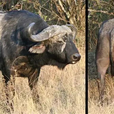 非洲野水牛:共有5个亚种。头体长2.1-3.4米,身高1-1.7米,体重300-900千克。胸膛宽…