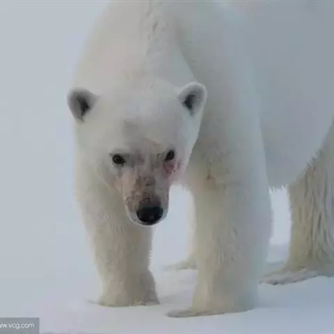 北极熊头部相对棕熊来较长而脸小,耳小而圆,颈细长,足宽大,肢掌多毛,皮肤呈黑色,可从北极熊的鼻头、爪垫、嘴唇以及眼睛四周的黑皮肤看出皮肤的原貌,黑色的皮肤有助于吸收热量,这又是保暖的好方法。北极熊的毛是无色透明的中空小管子,外观上通常为白色,但在夏季由于氧化可能会变成淡黄色、褐色或灰色。