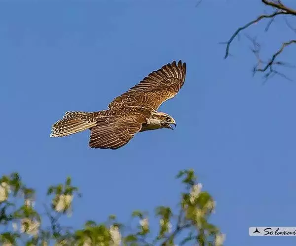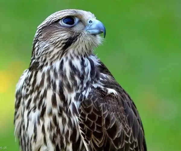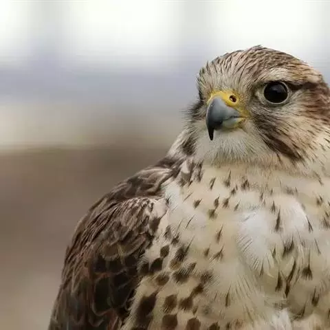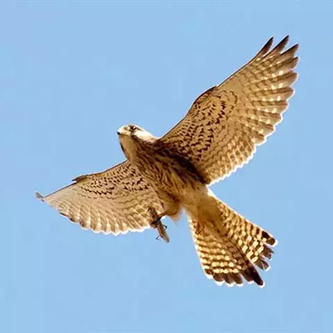 猎隼体重510-1200克,体长278-779毫米。猎隼是体大且胸部厚实的浅色隼。颈背偏白,头顶浅褐。 猎隼 头部对比色少,眼下方具不明显黑色线条,眉纹白。上体多褐色而略具横斑,与翼尖的深褐色成对比。尾具狭窄的白色羽端。下体偏白,狭窄翼尖深色,翼下大覆羽具黑色细纹。翼比游隼形钝而色浅。幼鸟上体褐色深沉,下体满布黑色纵纹。叫声似游隼但较沙哑。 [1-2]