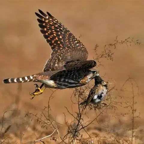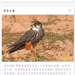 燕隼:是隼科、隼属的鸟类。体长约36厘米,体重140-340克。体形比猎隼、游隼等都小,为小型猛禽,…