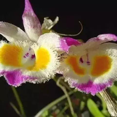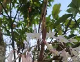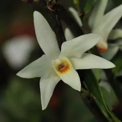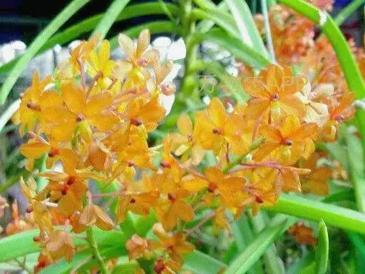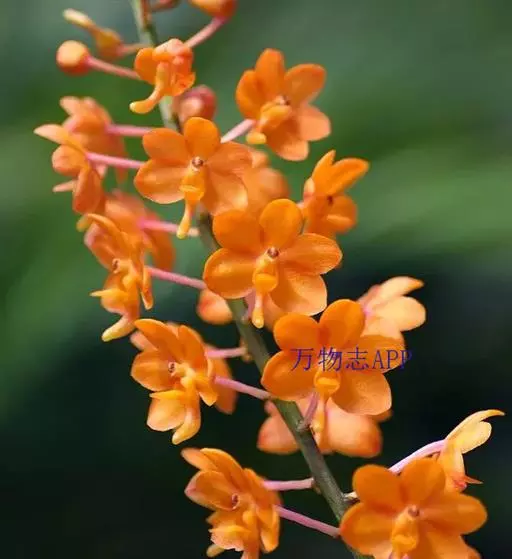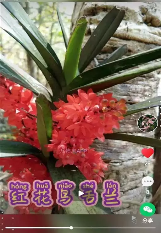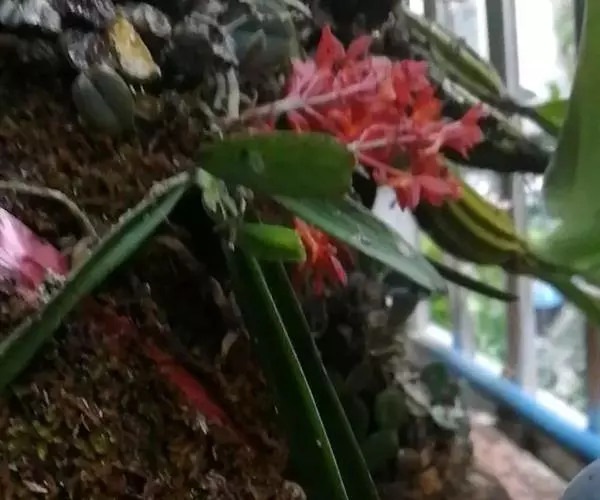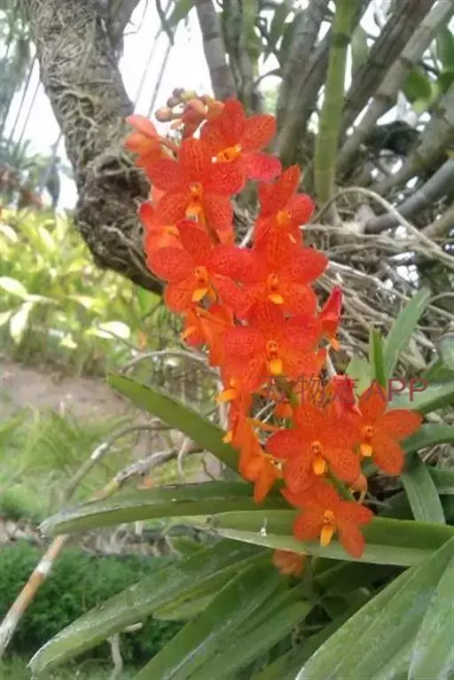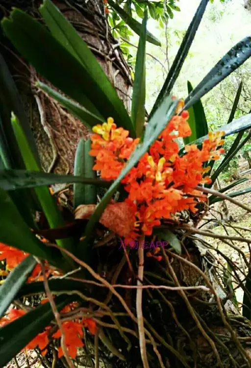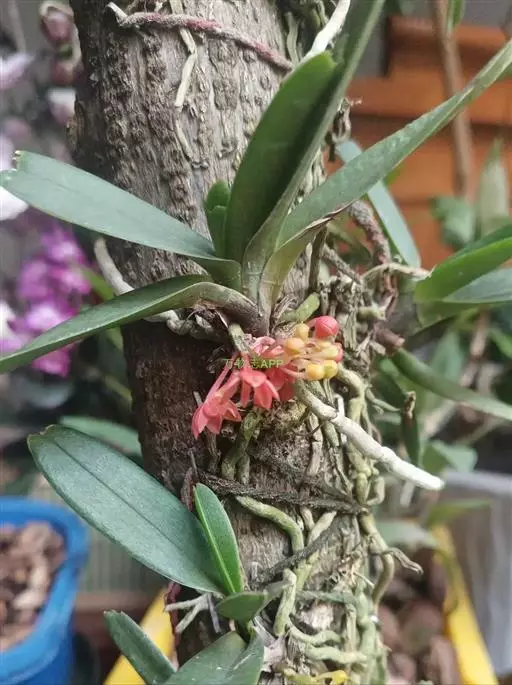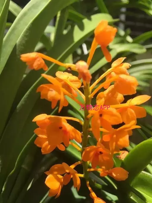 鸟舌兰(学名:Ascocentrum ampullaceum (Roxb.) Schltr.):植株高约10厘米。茎直立,粗壮,长1-4厘米,被叶鞘所包。叶厚革质,扁平,下部常V字形对折,上部稍向外弯,上面黄绿色带紫红色斑点,背面淡红色。总状花序密生多数花;花苞片很小,卵状三角形,长约1毫米,先端急尖;唇瓣3裂;侧裂片黄色,很小,直立,近三角形,先端稍钝,前侧边缘内折;药帽紫褐色,前端稍收狭,先端钝并且翘起;花粉团茄紫色,具狭扁而曲膝状的柄和近椭圆形的粘盘。花期4-5月。