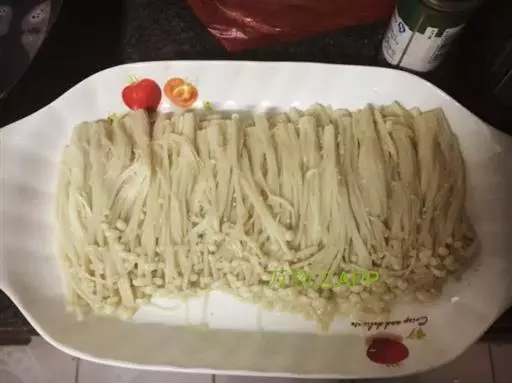 ⑴预煮把5%~10%食盐水置于铝锅内煮沸,倒入金针菇,煮沸5~7分钟,捞出沥去水分。