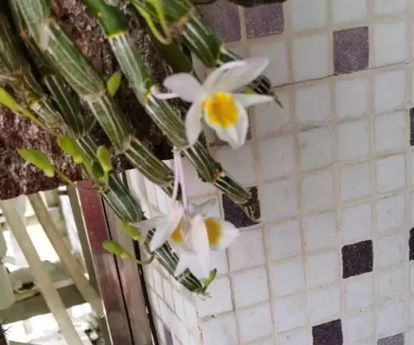 玫瑰石斛(学名:Dendrobium crepidatum Lindl. ex Paxt.):茎悬垂,肉质状肥厚,青绿色,圆柱形,不分枝,具多节,节间长3-4厘米。叶近革质,狭披针形。总状花序很短,从落了叶的老茎上部发出,具1-4朵花;花质地厚,开展;萼片和花瓣白色,中上部淡紫色,干后蜡质状;花瓣宽倒卵形,长2.1厘米,宽1.2厘米,先端近圆形,具5条脉;唇瓣中部以上淡紫红色,中部以下金黄色,近圆形或宽倒卵形。花期3-4月。