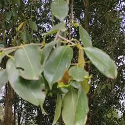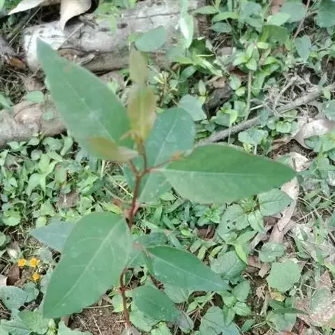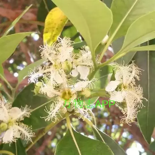 乔木,高20米,胸径约50厘米;树皮黑褐色,多少宿存,坚硬;嫩枝初时扁而有棱,稍;后变圆形,有短毛。叶片革质,聚生于枝顶,假轮生,长圆形或卵状披针形,长7-15厘米,宽3-7厘米,先端渐尖或尖锐,基部楔形,上面多突起腺点,下面有时带灰色,侧脉12-18对,相隔3-6毫米,以50度-60度开角斜向上,在下面稍突起,网脉明显;叶柄长1-2厘米,扁平。
