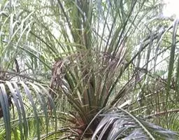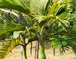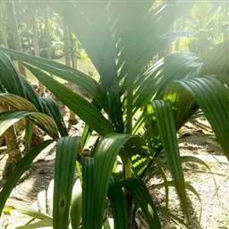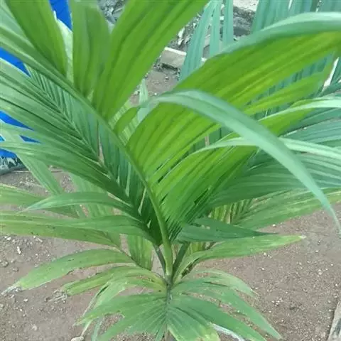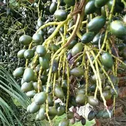 布迪椰子 布迪椰子采用种子繁殖,其发芽类型为毗邻型(近距带鞘型)。当种子萌发时,子叶柄突出种皮,将子叶肢送出种皮之外便停止生长,然后子叶肢贴近种侧分化出幼根及鞘。种子发芽较慢且很不整齐,一般10-11月播种到次年4-5月才发芽,第一年发芽率为40%左右。未发芽的种子留床到第三年还会出芽20%左右。因此,未发芽的种子不可轻易丢弃,因其果核含种子1-3粒,会从同一果核中长出1-3株苗。初生叶为全缘亚型。