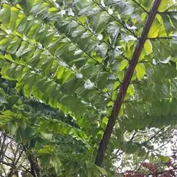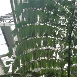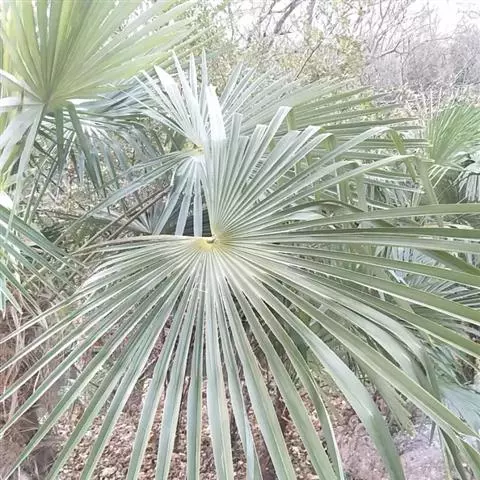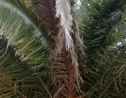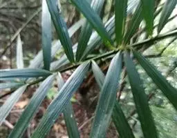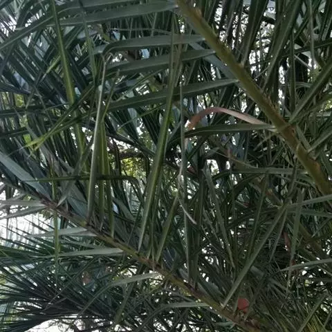 羽状叶长2.6米,弯曲如弓形,有羽片25-50对,厚革质,叶端尖锐,羽片沿叶轴两侧以对生或互生的方式呈2列排列,小叶片长0.4-0.7米,灰绿色,叶柄具刺。