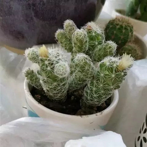 银手球,仙人掌科乳突球属,植株群生,小短圆筒形。原产墨西哥伊达尔戈州。