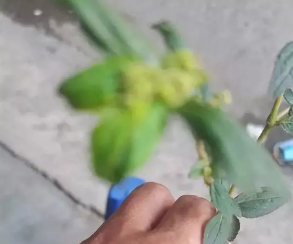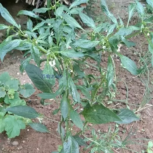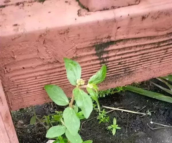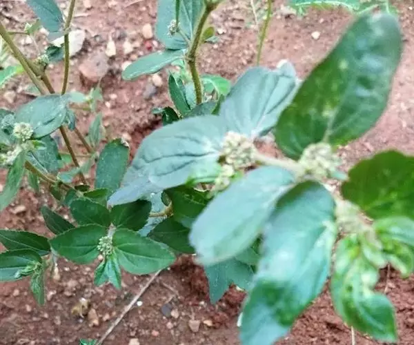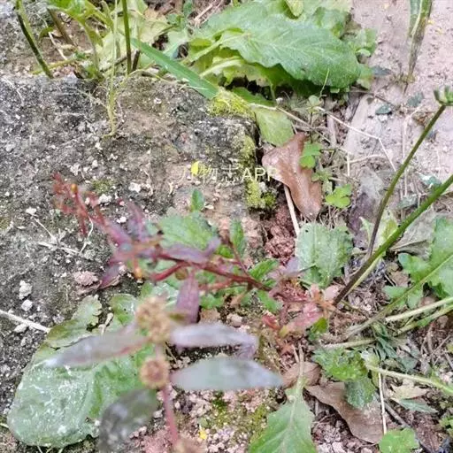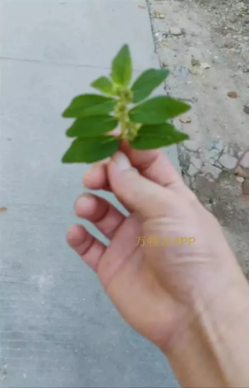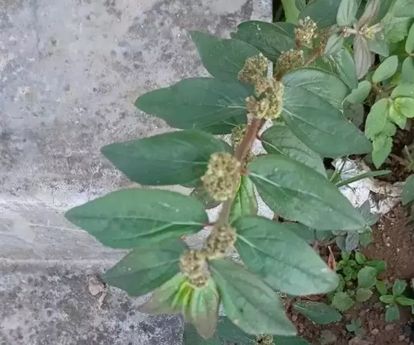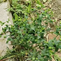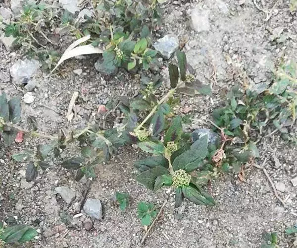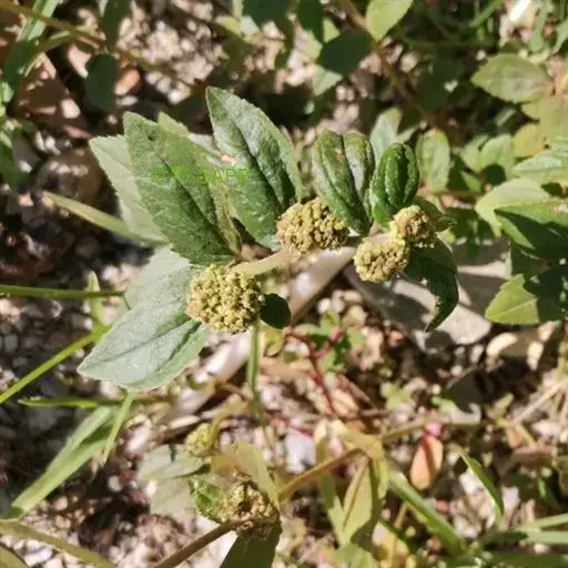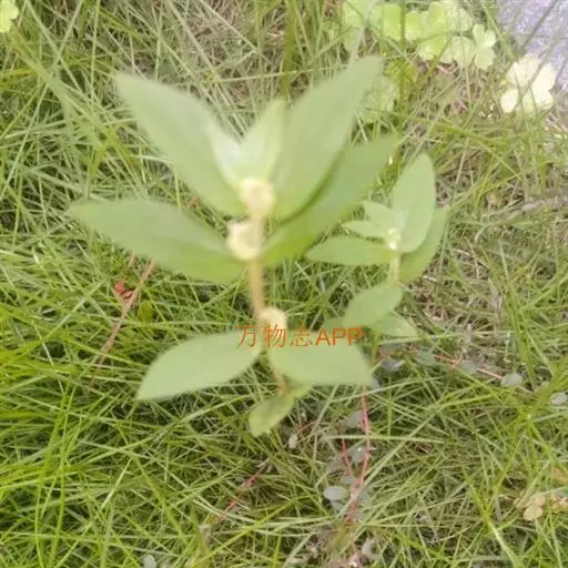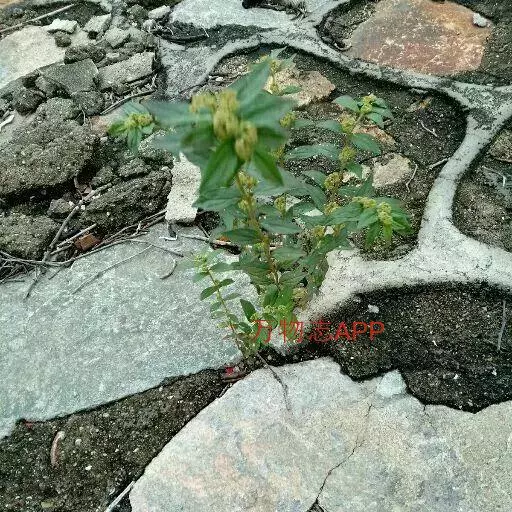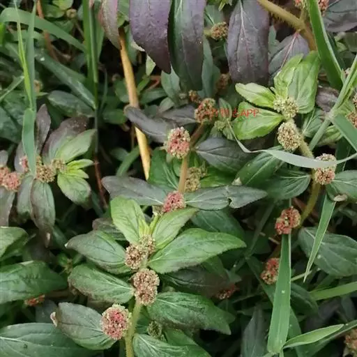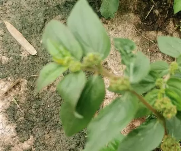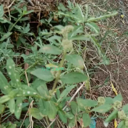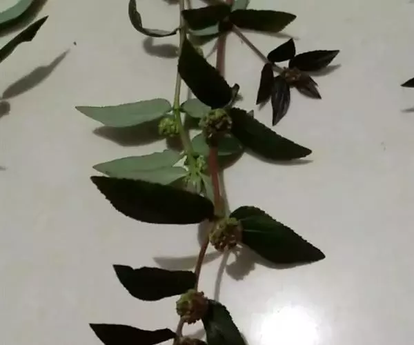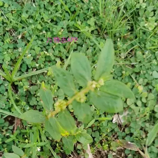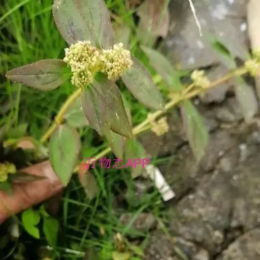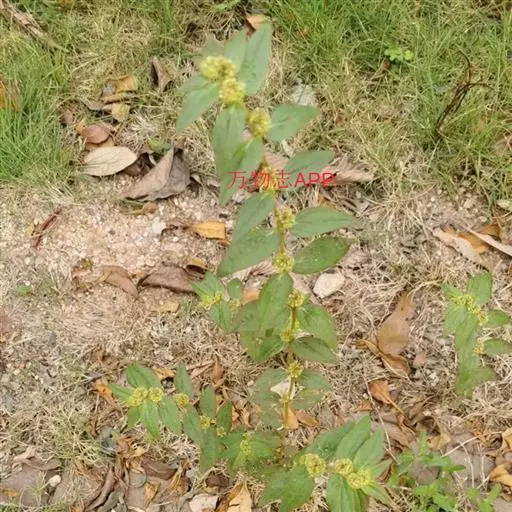 飞扬草 一年生草本。其茎呈近圆柱形,长15~1250px,直径l~3mm。表面黄褐色或浅棕红色;质脆,易折断,断面中空;地上部分被长粗毛。叶对生,皱缩,展平后叶片椭圆状卵形或略近菱形,长l~100px,宽0.5~32.5px;绿褐色,先端急尖或钝,基部偏斜,边缘有细锯齿,有3条较明显的叶脉。聚伞花序密集成头状,腋生。蒴果卵状三棱形。常生于向阳山坡、山谷、路旁或灌丛下。