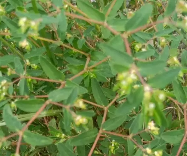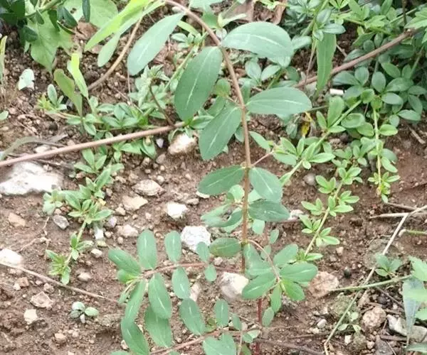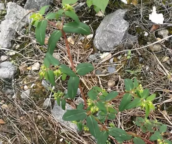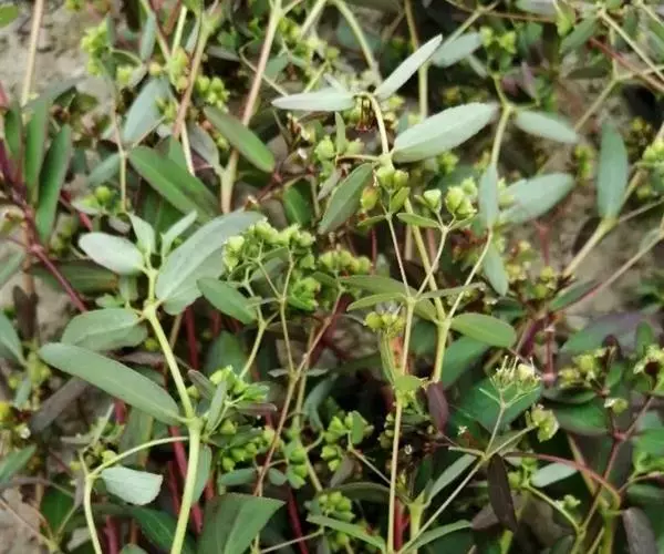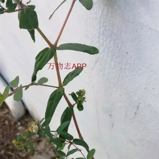 一年生草本,含白色乳汁。茎匍匐,多分枝,稍被毛,高不及15厘米,通常红色。叶对生,椭圆形至矩圆形,长4~6毫米,很少达8毫米,宽2~4毫米,先端钝,基部偏斜而截头状,边缘有极小的锯齿,上面深绿色,下面浅绿带灰白色;叶柄甚短;托叶细小,生于叶柄基侧。杯状花序单生或少数聚伞状排列于叶腋;几无柄;总苞陀螺状,淡紫色,长约1毫米;腺体4,漏斗状;花单性,无花被;雌雄花同生于总苞内;雄花多数,只具雄蕊1;雌花1,生于花序中央,子房3室,花柱2,离生且顶端2裂。蒴果有毛,卵状三棱形,长1.5毫米许。种子有纵沟纹5~6条。花期夏季。