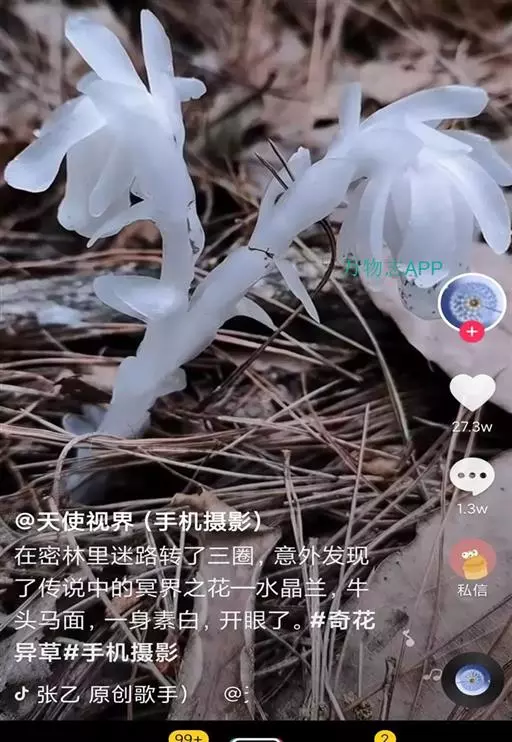 在我国陕西的周至殿镇田峪景区,以及云南的昆明市海口林场,先后发现了一种罕见植物。它株高十多厘米,根茎直立不分枝,全身晶莹剔透,簇拥生长在腐叶之上,人称冥界之花,或称死亡之花、梦兰花、腐生花等。它在一些小说中也被视为幽灵之花,或是致人毙命的毒物,或是起死回生的仙草。