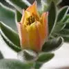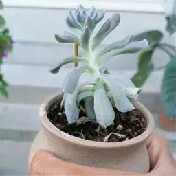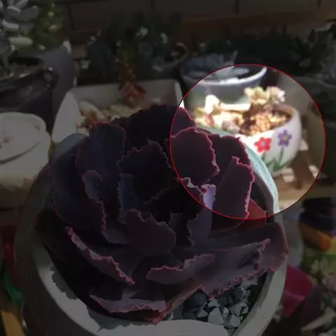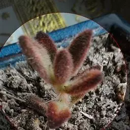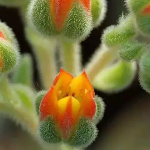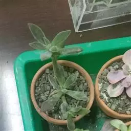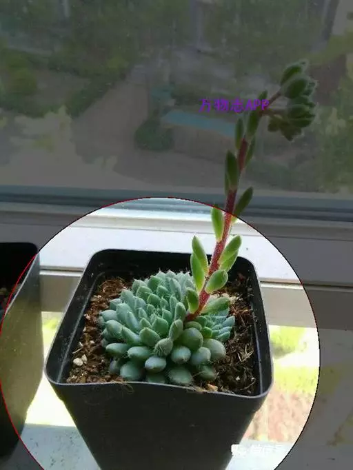 小蓝衣叶片环生,叶片肥厚有粉,没有明显的棱,光线不够叶片会微扁且拉长,叶尖两侧有不太密集的长绒毛,叶尖也略带长绒毛。强光下,叶尖会出现漂亮的红。小蓝衣为聚伞花序,花开颜色:红色或紫红色。