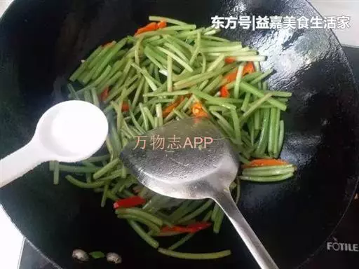 5. 放入炸好的四季豆炒匀,放入糖、鸡精和盐炒匀后出锅。