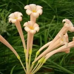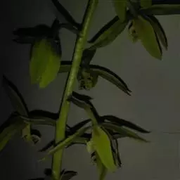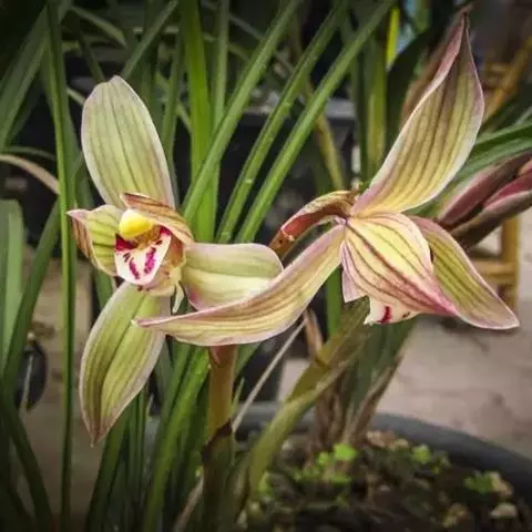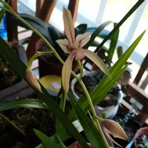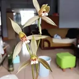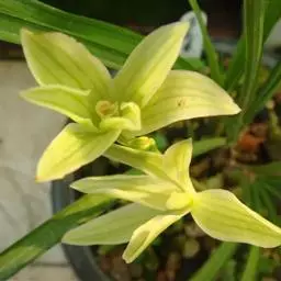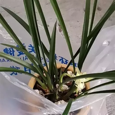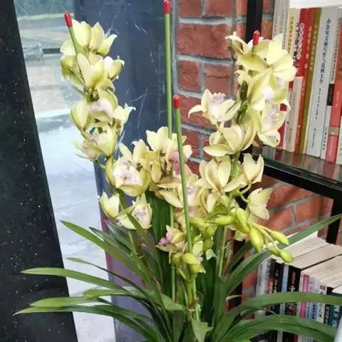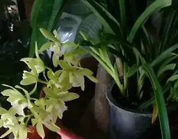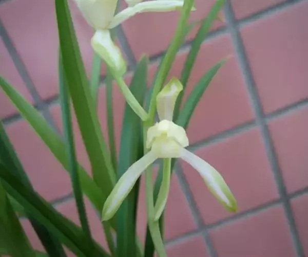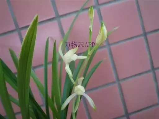 建兰素花,绿白色(接近纯白),清香,一枝开花5至12朵。叶色钢青,细而挺拔,有铮铮铁骨之相,所以叫铁骨素。在日本称其为天香,又得名天香素。花期7至11月份。