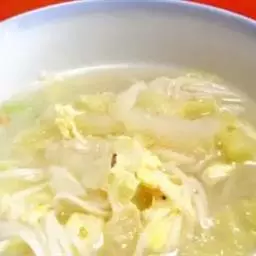 3、煮熟后,汤中加鸡精和盐,放入小白菜和粉丝,略煮离火,撒上麻油和胡椒粉即成;